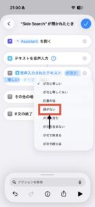 [音声入力されたテキスト][が次と等しい][すべて]の場合と表示されていると思うので、[が次と等しい]をタップして「値がない」を選択します。