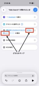 [音声入力されたテキスト][が次と等しい][すべて]の場合と表示されていると思うので、[が次と等しい]をタップして「値がない」を選択します。